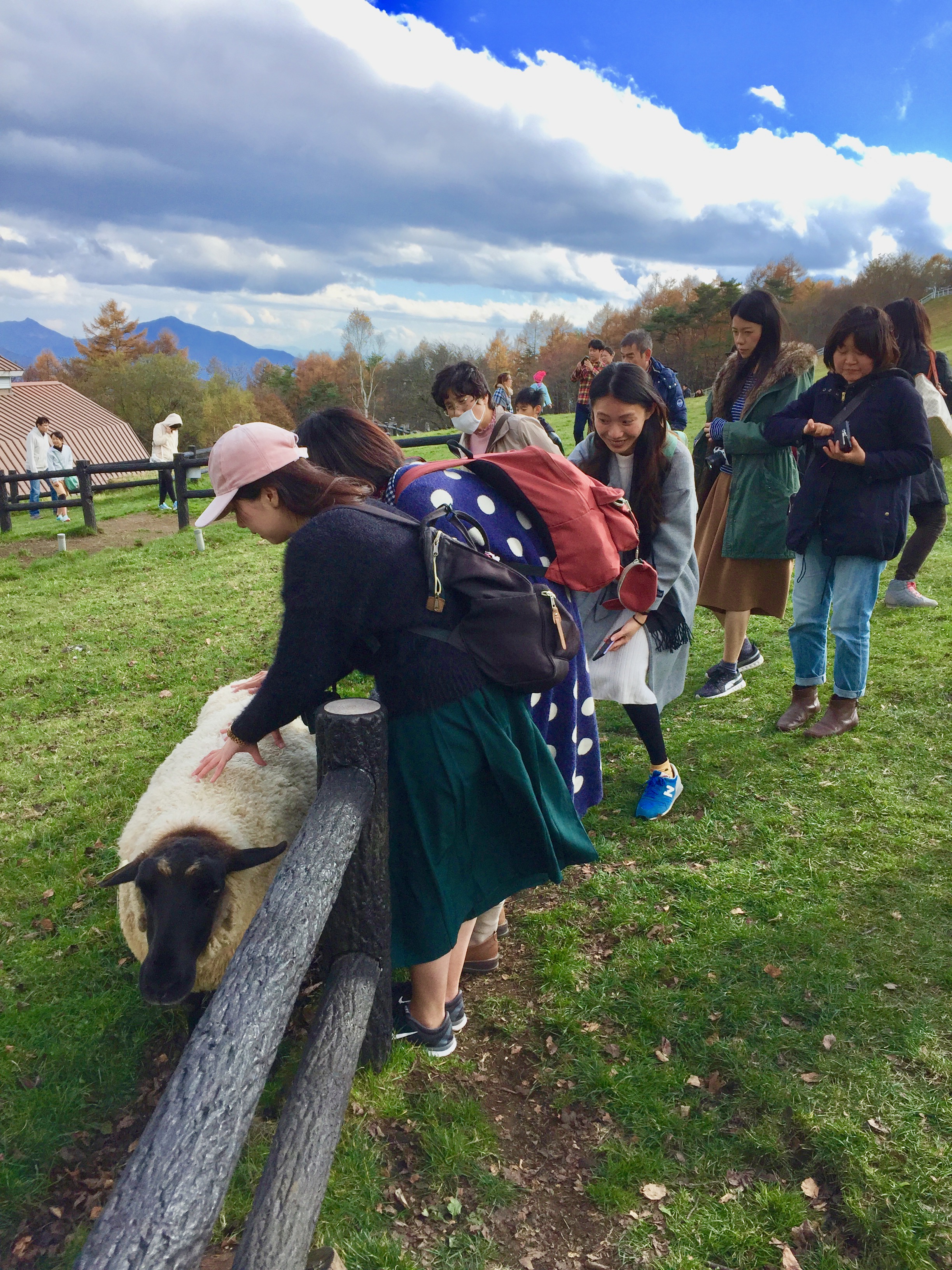 牧場で遊ぶ観光客
